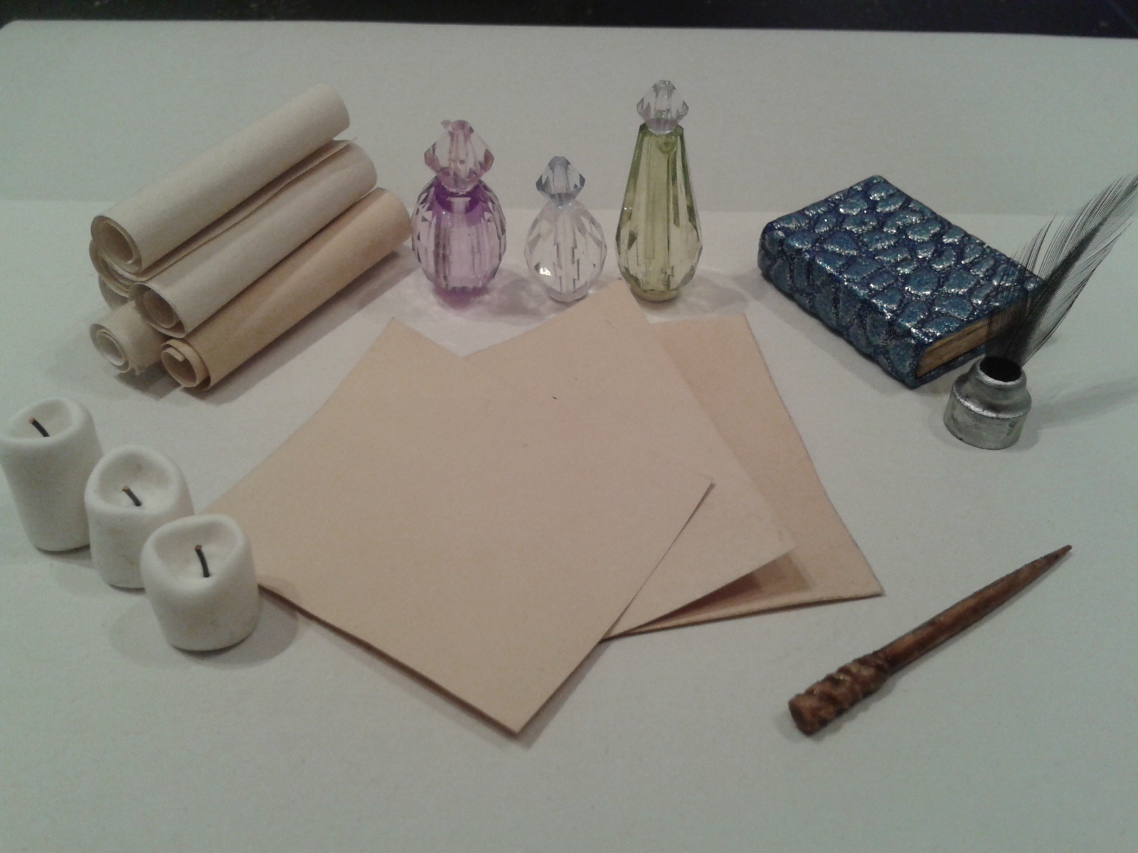 This set of witchy accessories will go to the lucky winner. Three Fimo candles, a stack of scrolls, three unfolded parchments, quill and ink, three potion bottles, one dragonscale book and a carved wand. Everything is hand made by me.